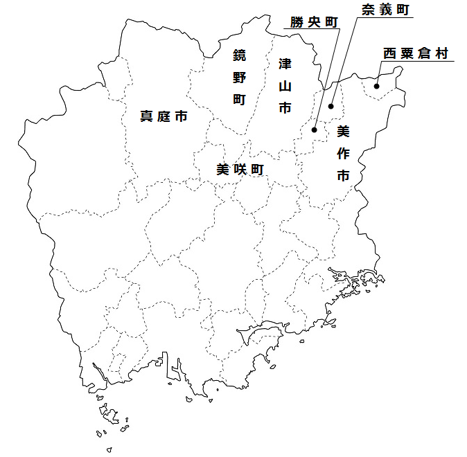 県北地域:津山市、鏡野町、奈義町、勝央町、美咲町、美作市、真庭市 等の市町村です